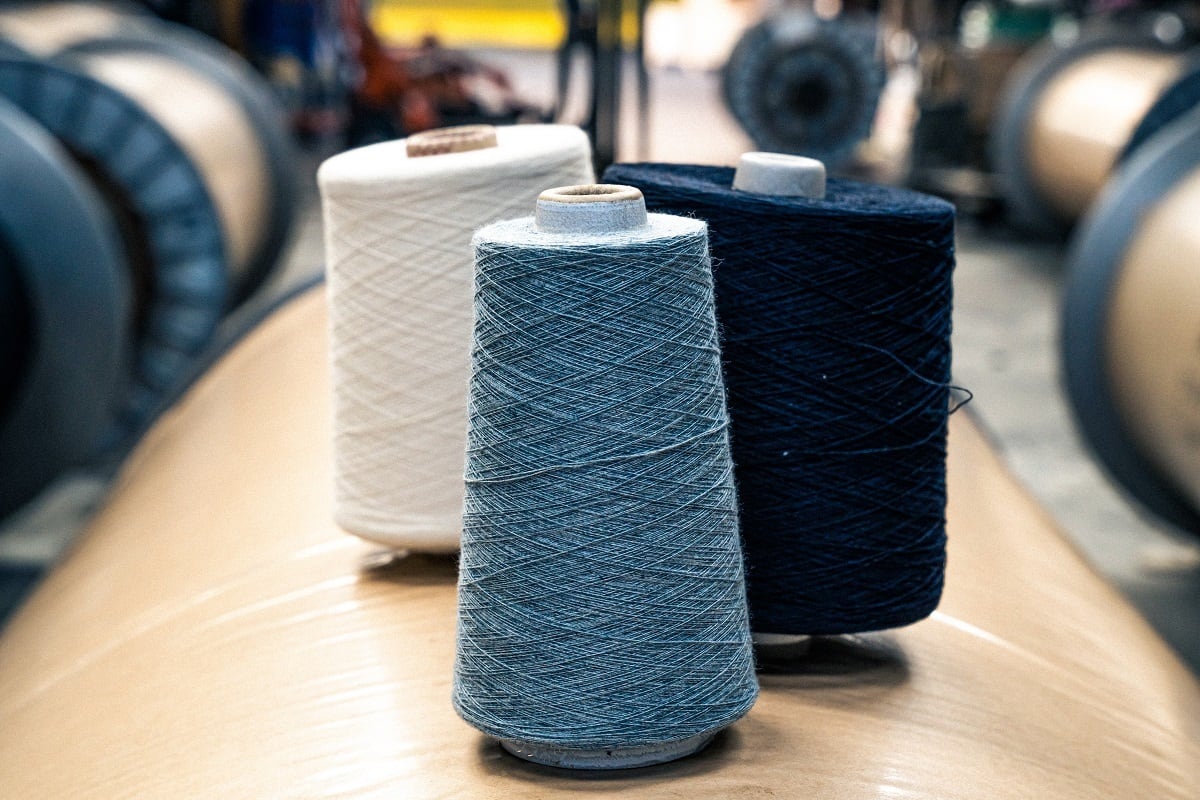 デニムやその他の廃棄された生地や製品を反毛し、再度糸に作り直したアップサイクルの糸