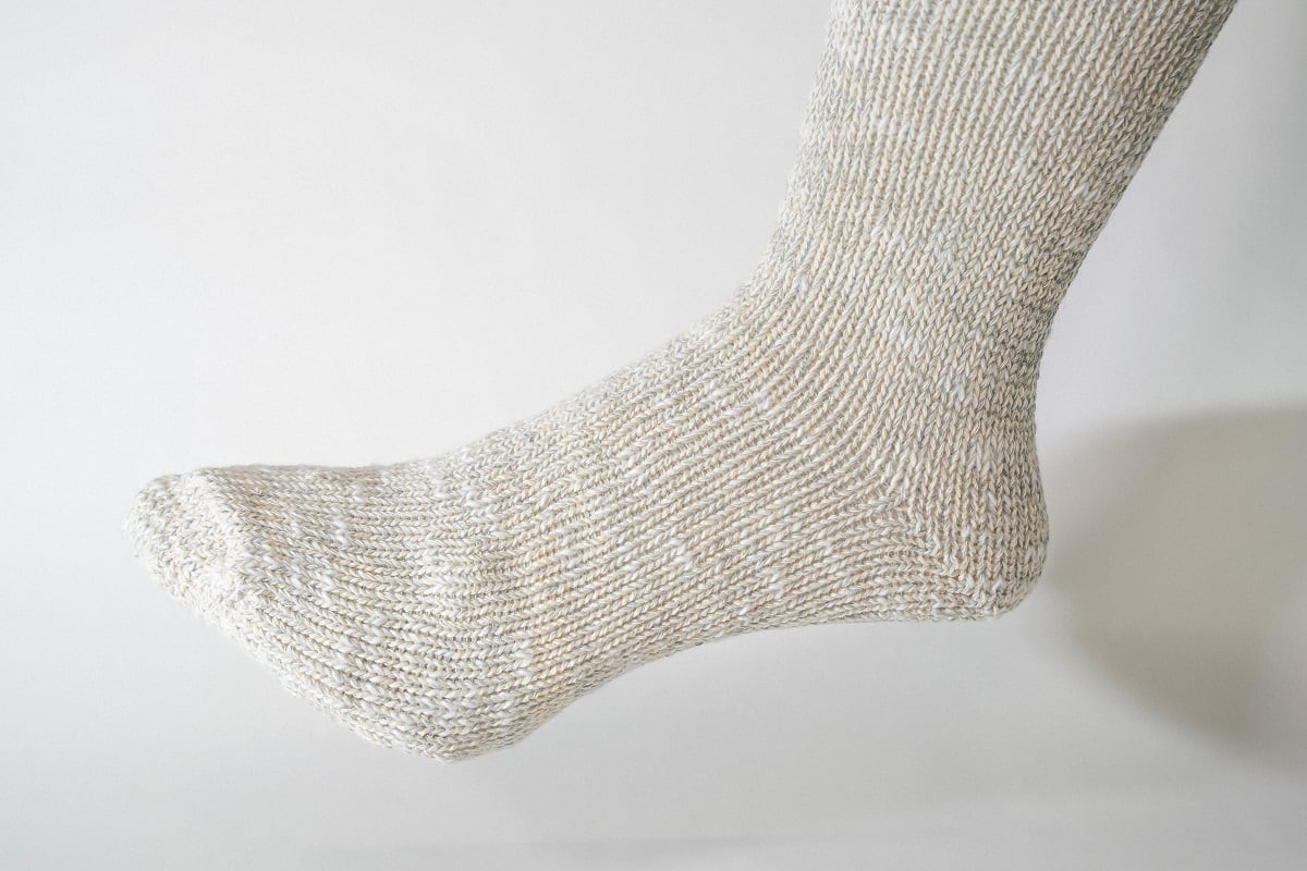 ローゲージならではのふっくらとした編み地に高級なデニムで使用される品質の良い綿糸が惜しみなく使われており、アップサイクル糸の色合いが優しい雰囲気を加えてくれたこのソックスは、重厚感のあるはき心地で他のソックスとは一味違います。